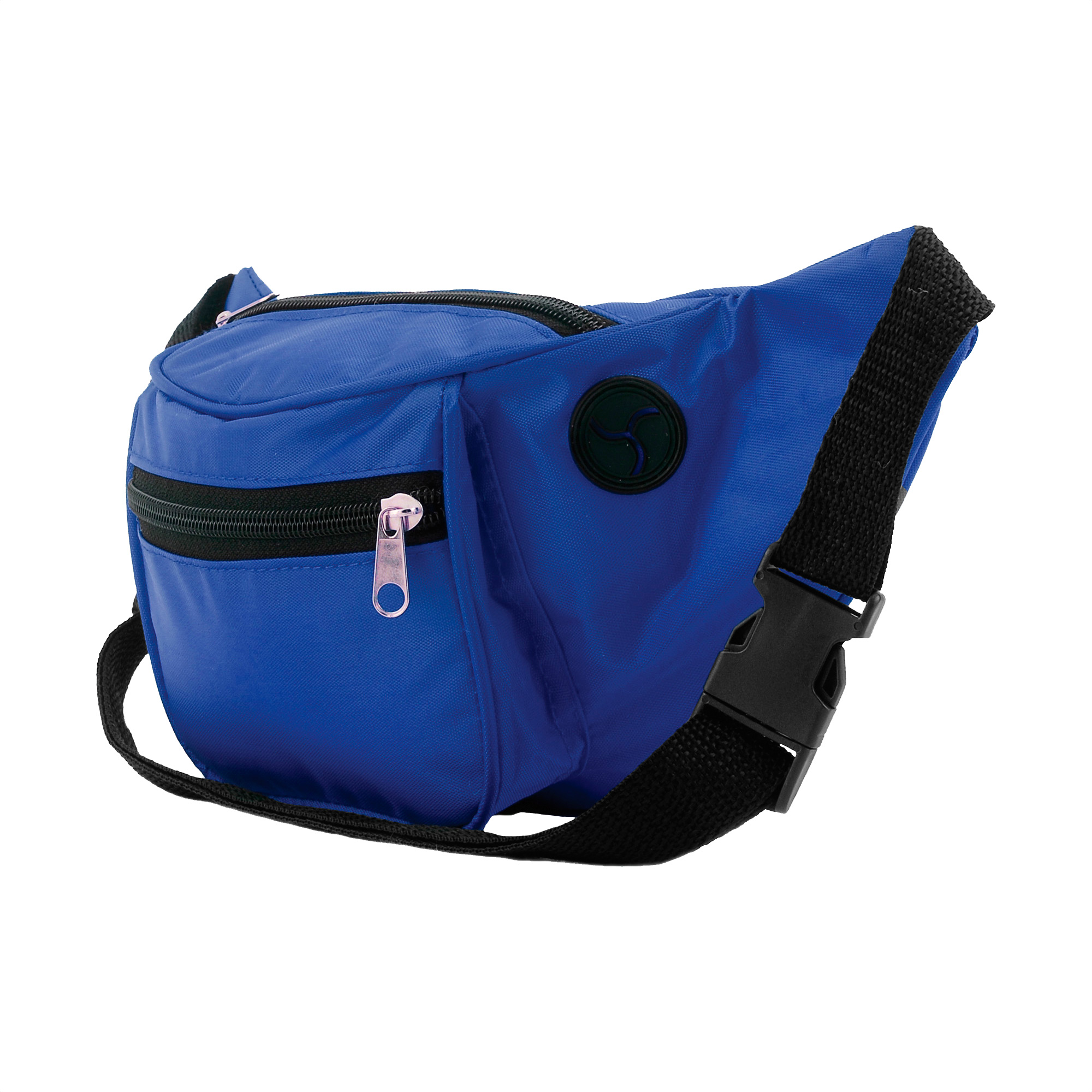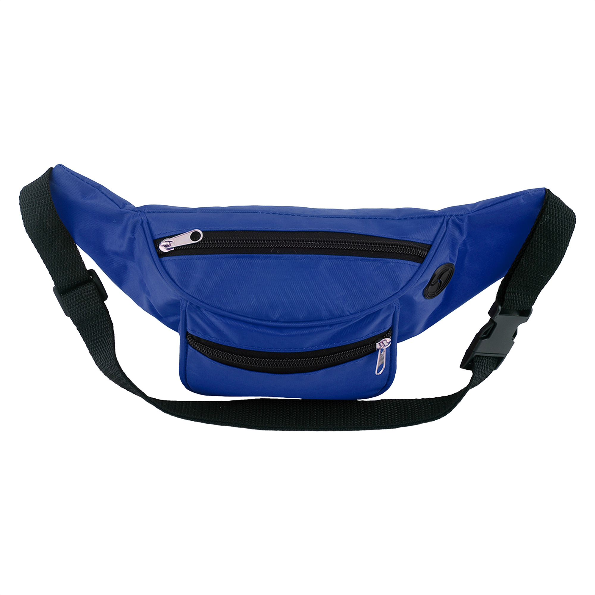 33 x 14,5 cm. Polyester 420D. Cangurera de 2 bolsillos. Salida para audífonos. Correa ajustable con herrajes plásticos. Cierres metálicos.