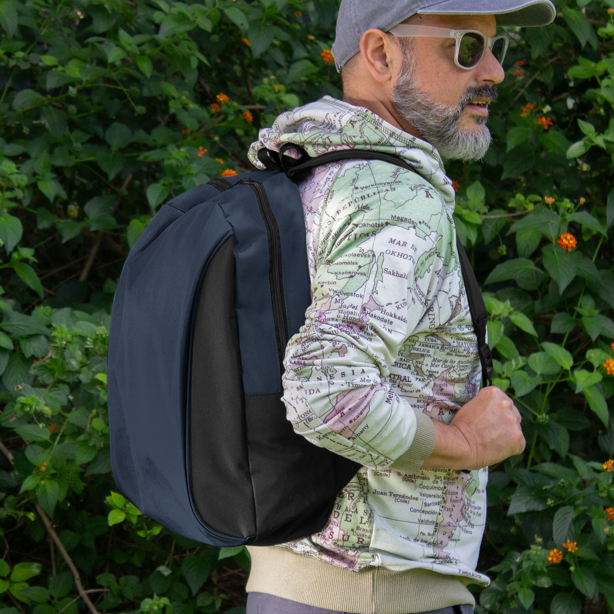 Morral urbano. Bitono (cuerpo principal de un color y laterales, espalda, correas, asa y cierres en color negro). Compartimento principal con cierre. Amplio compartimento frontal con cierre lateral vertical. Interior forrado y reforzado. Correas ajustables y espalda acolchada. Tiradores de cierres metálicos.