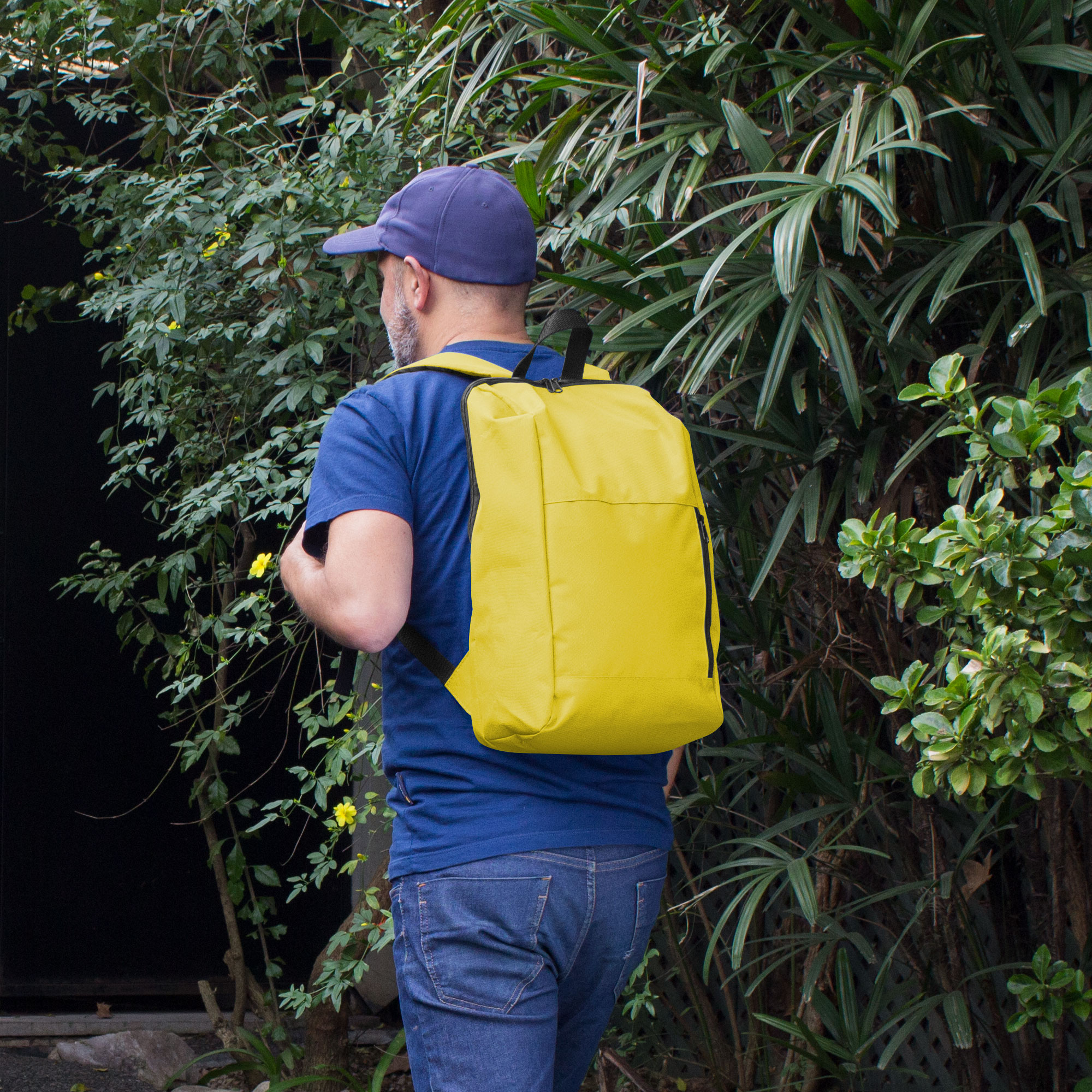 Morral urbano. Bitono (cuerpo principal de un color, correas combinadas, asa y cierres en color negro). Compartimento principal con cierre. Bolsillo frontal con cierre lateral vertical. Correas ajustables. Tiradores de cierres metálicos.