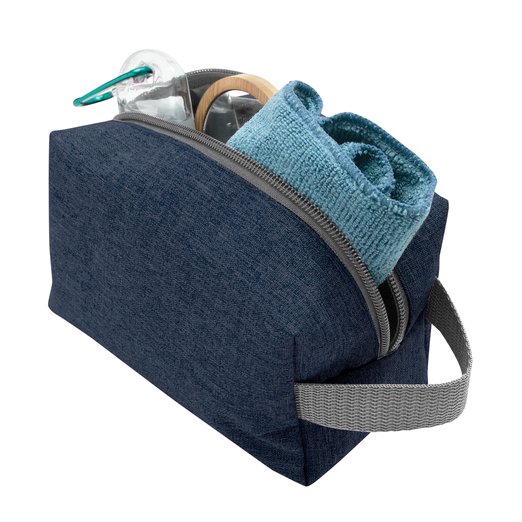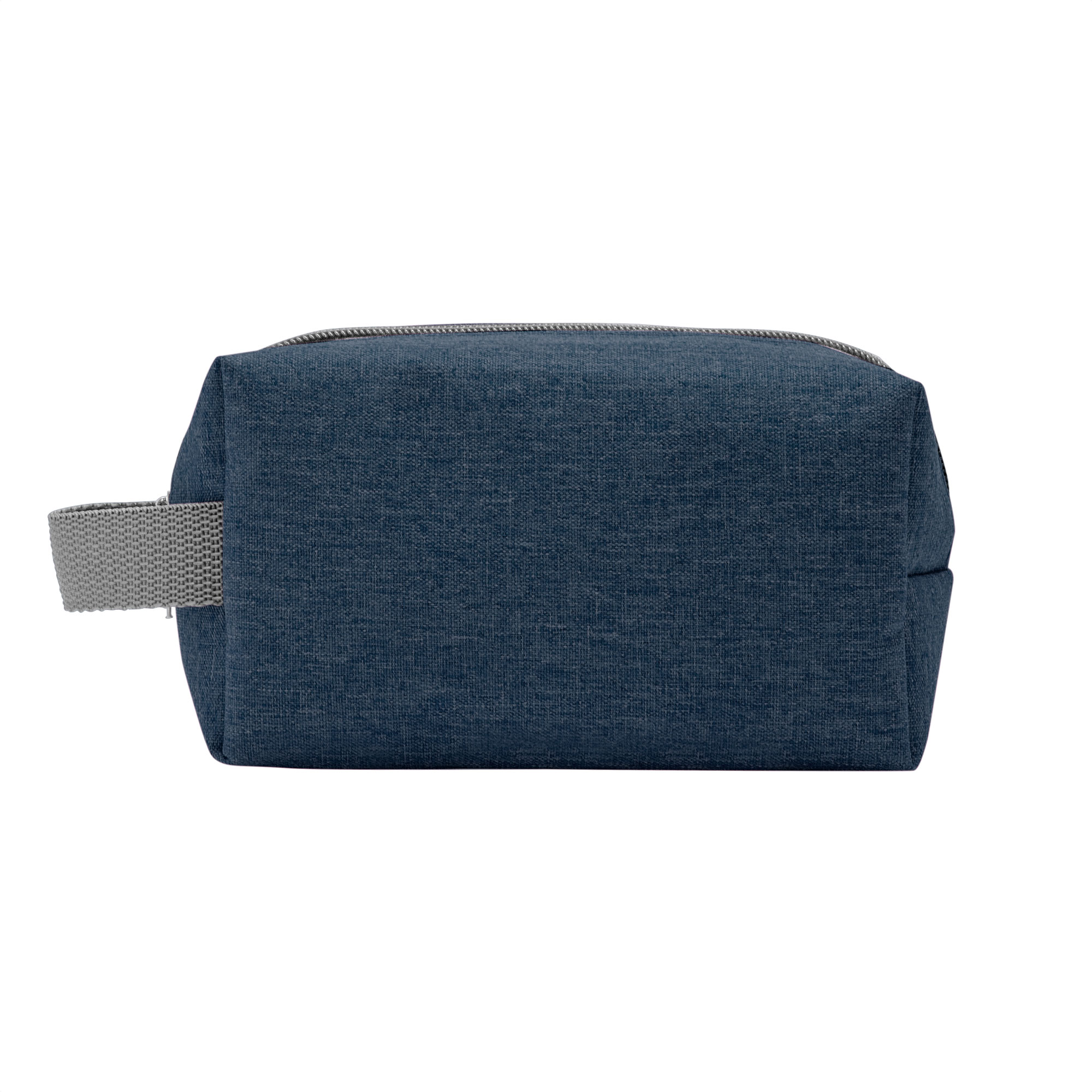 Necessaire con amplio compartimento. Interior forrado en Poliéster 210D. Cierre con tirador metálico y asa lateral en tela de color gris.