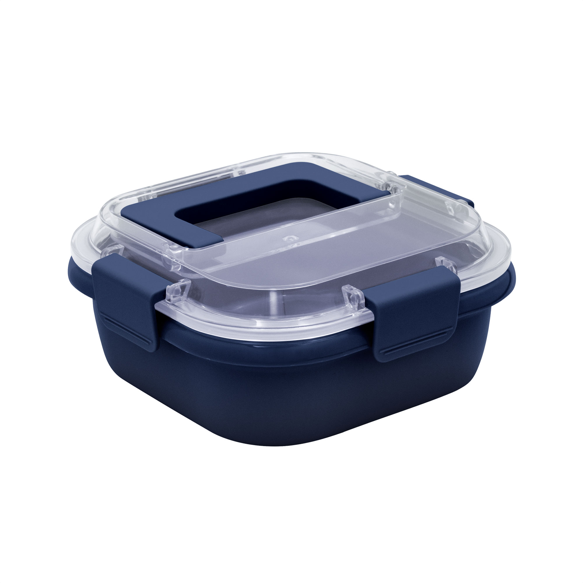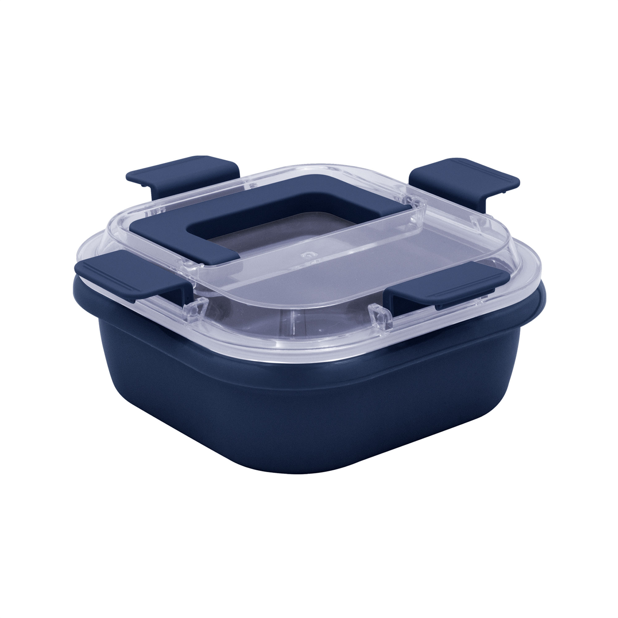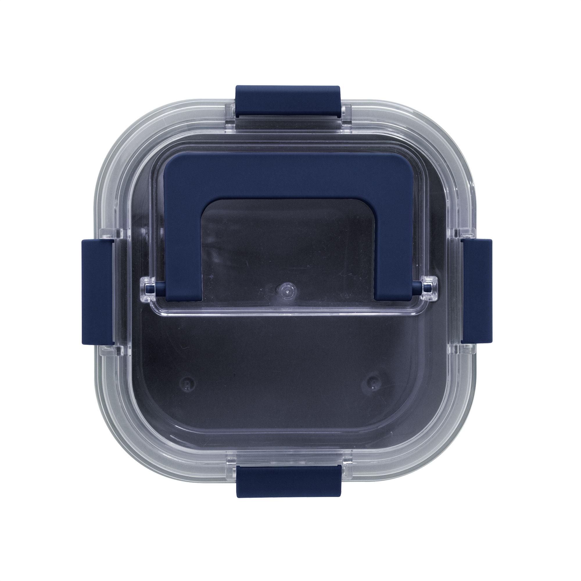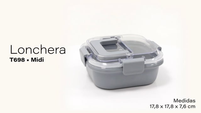 17,8 x 17,8 x 7,6 cm. Capacidad 1 litro. Plástico Polipropileno. Contenedor de alimentos. Tapa translúcida con cuatro clips de cierre hermético y asa para trasladar cómodamente. Clips y asa del mismo color que el recipiente.