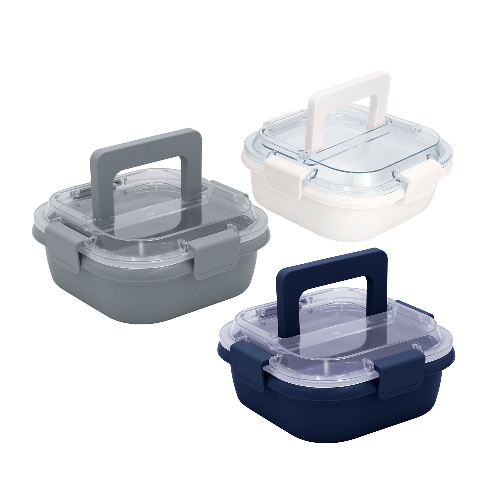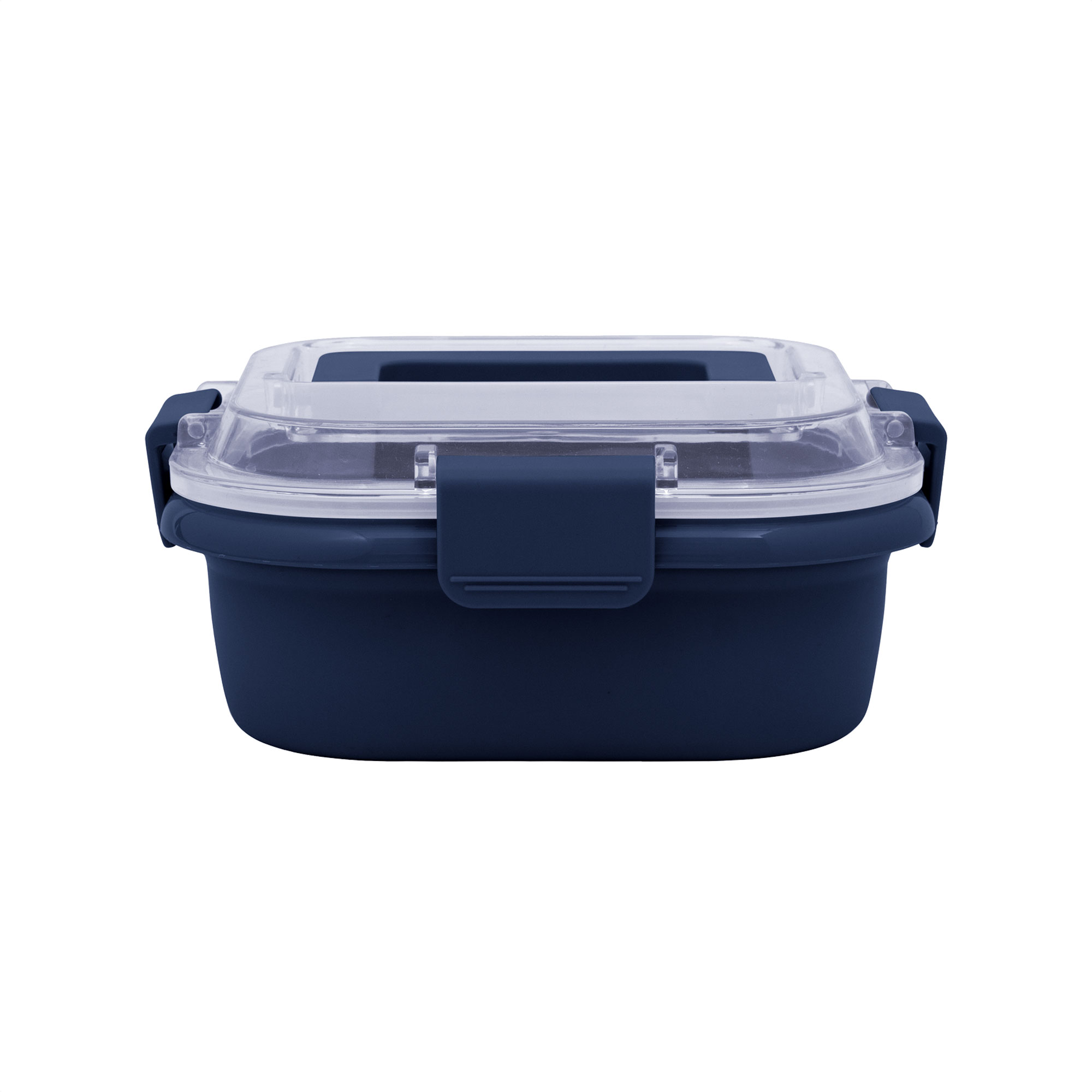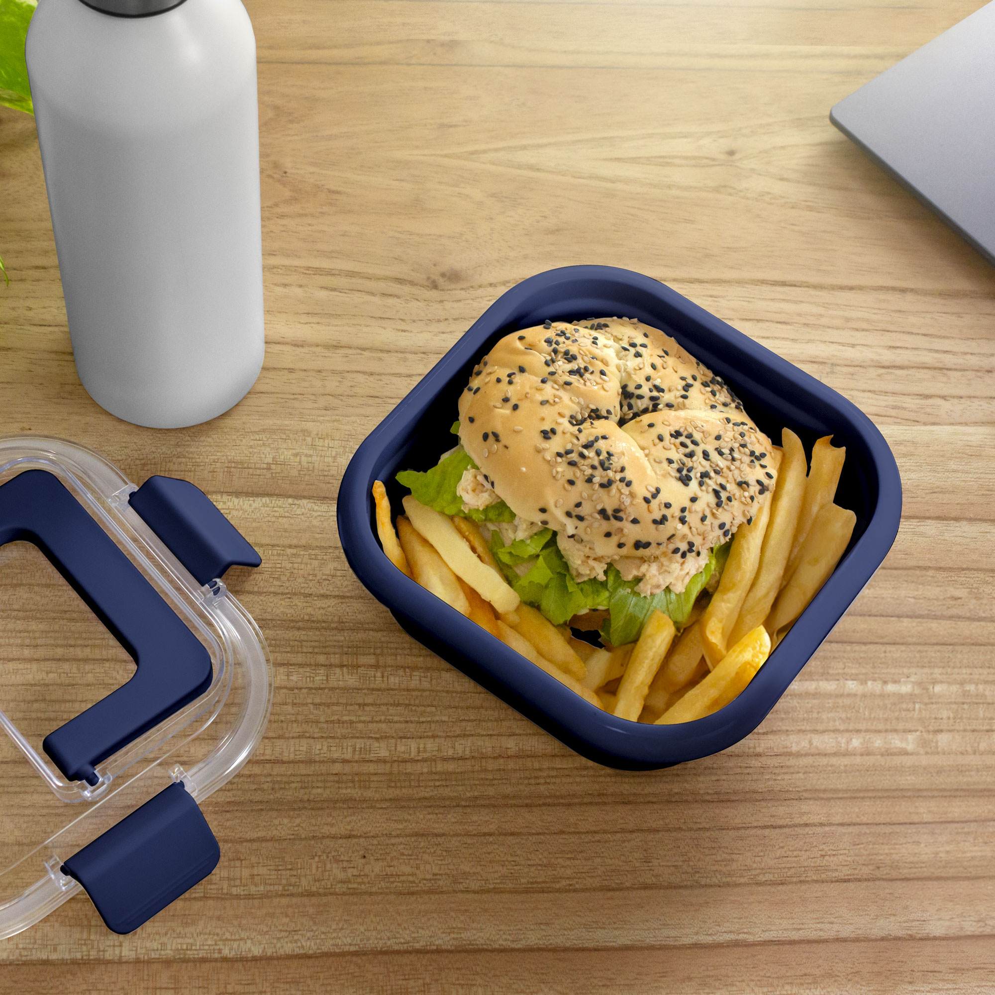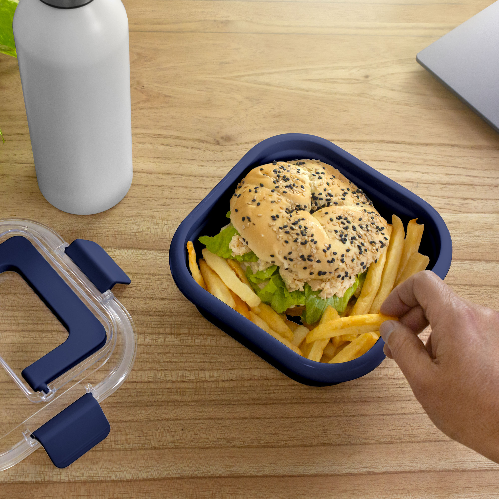 17,8 x 17,8 x 7,6 cm. Capacidad 1 litro. Plástico Polipropileno. Contenedor de alimentos. Tapa translúcida con cuatro clips de cierre hermético y asa para trasladar cómodamente. Clips y asa del mismo color que el recipiente.