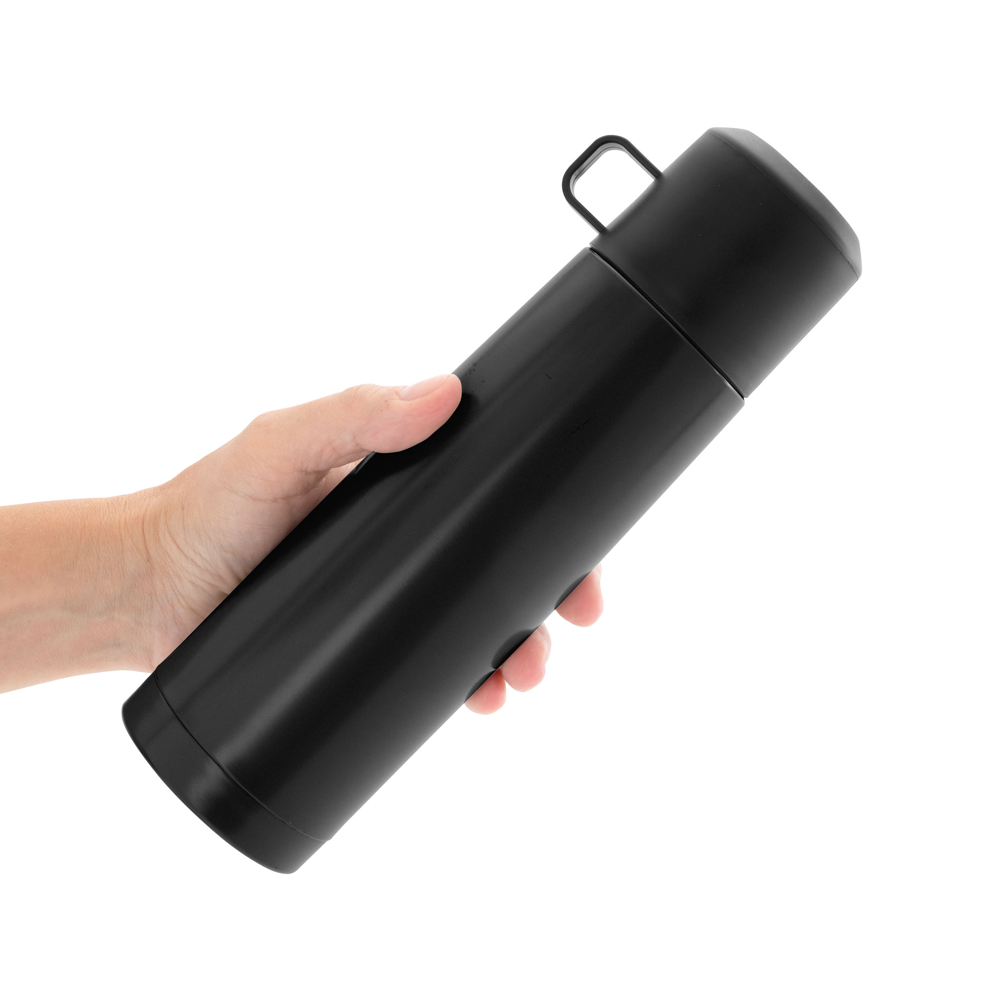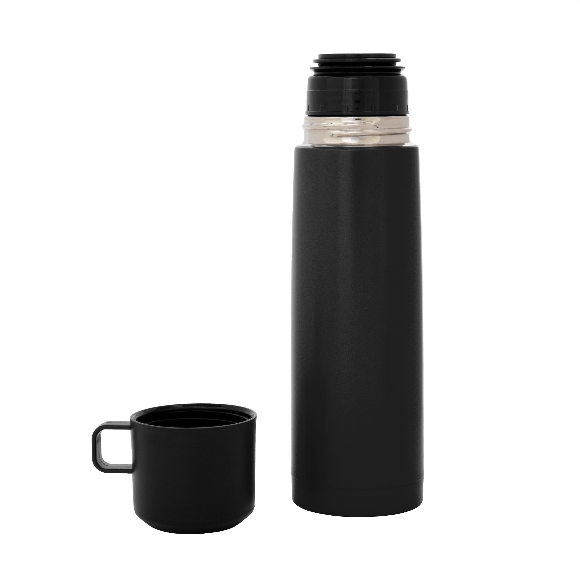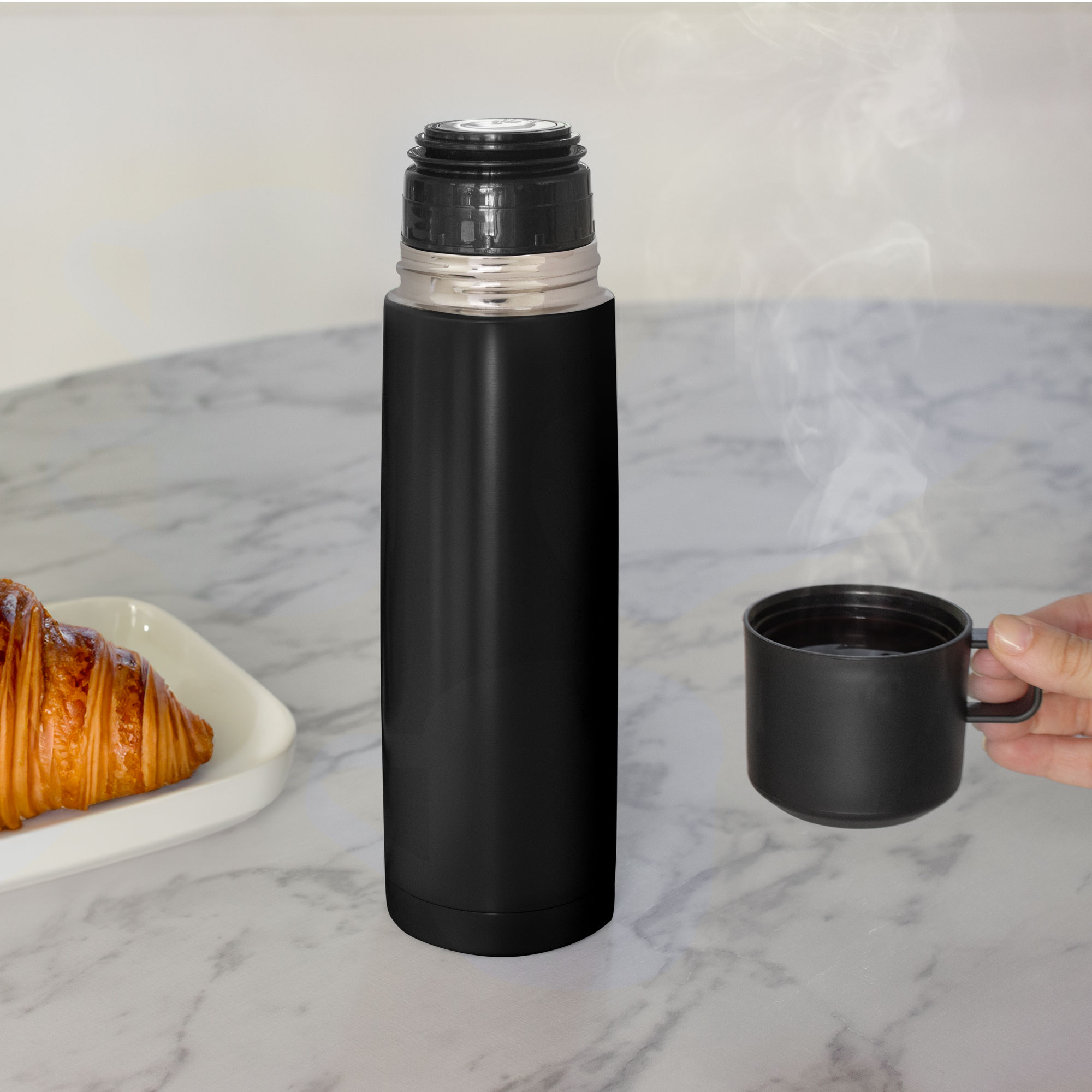 Termo con doble pared sellado al vacío. Tecnología vacuum. Acero inoxidable 304 interior / 201 exterior. Tapa y taza plásticas en color negro. Pintura acabado mate. Mantiene hasta 6 hs la temperatura de las bebidas calientes y 12 hs de las bebidas frías.