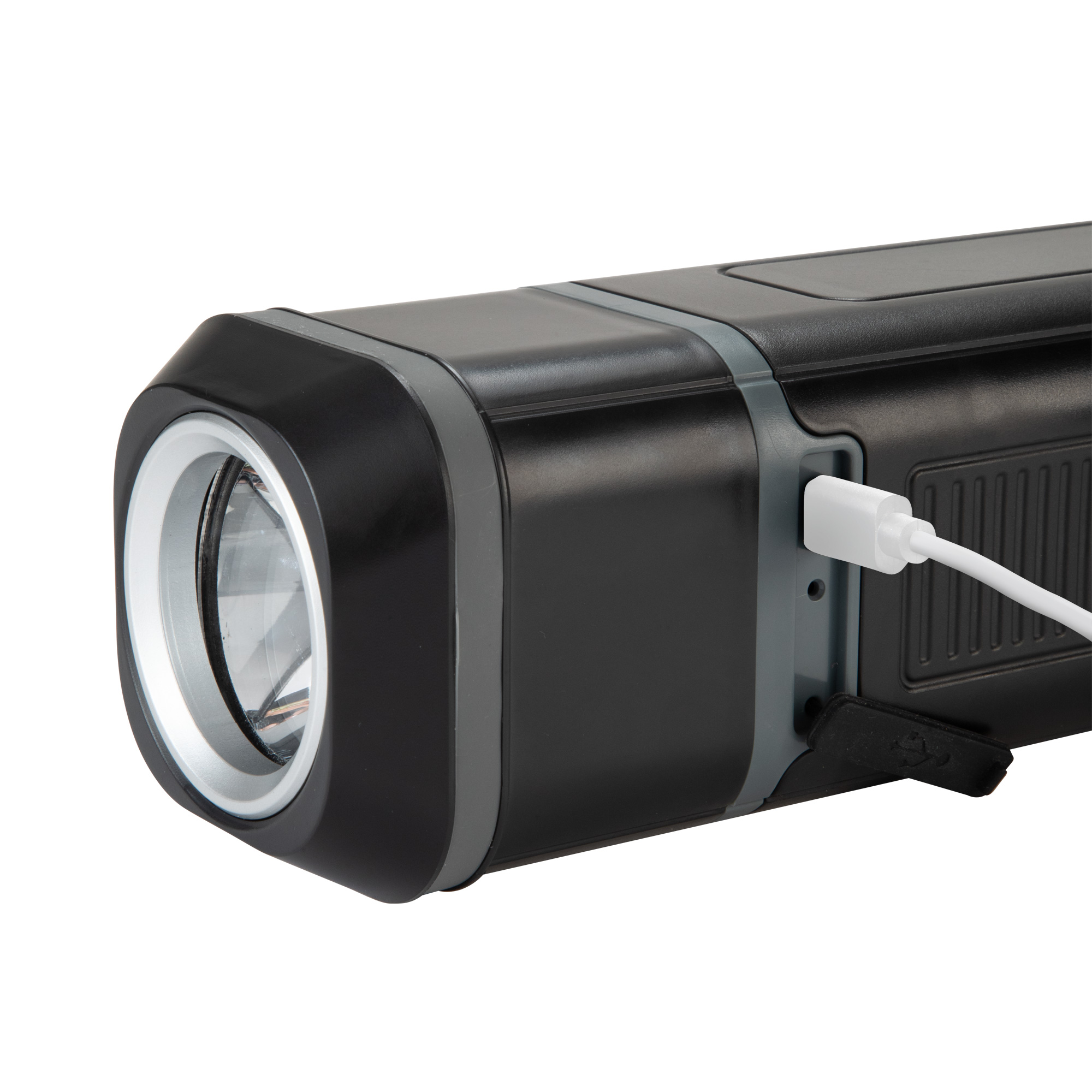 Linterna con set de herramientas. Batería de litio recargable. Linterna desmontable con base imantada. El set incluye: 2 llaves bristol hexagonales de 4 y 6 mm., 1 bisturí de hoja ancha, 1 cinta métrica de 1m., 2 destornilladores de precisión (punta plana y estrella), 1 mango de destornillador, 1 barra de extensión, 1 conector, 9 puntas de destornillador (2 planas, 3 estrella y 3 torx), 6 llaves copa (5 a 10 mm.) y 1 cable de carga color blanco.