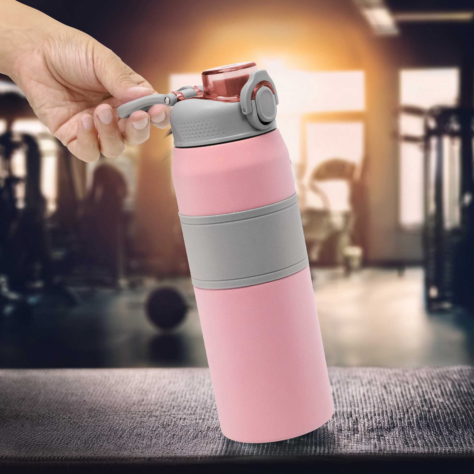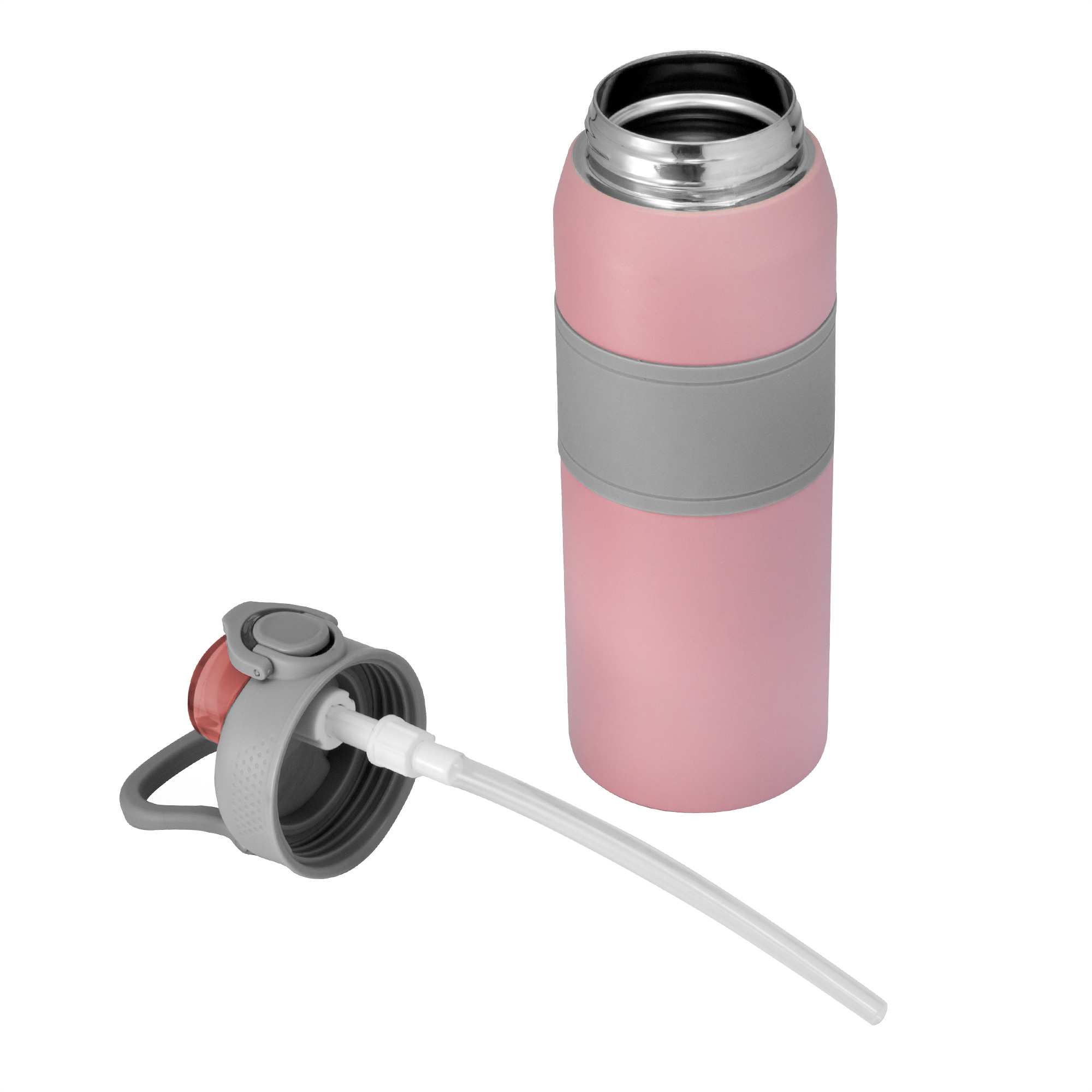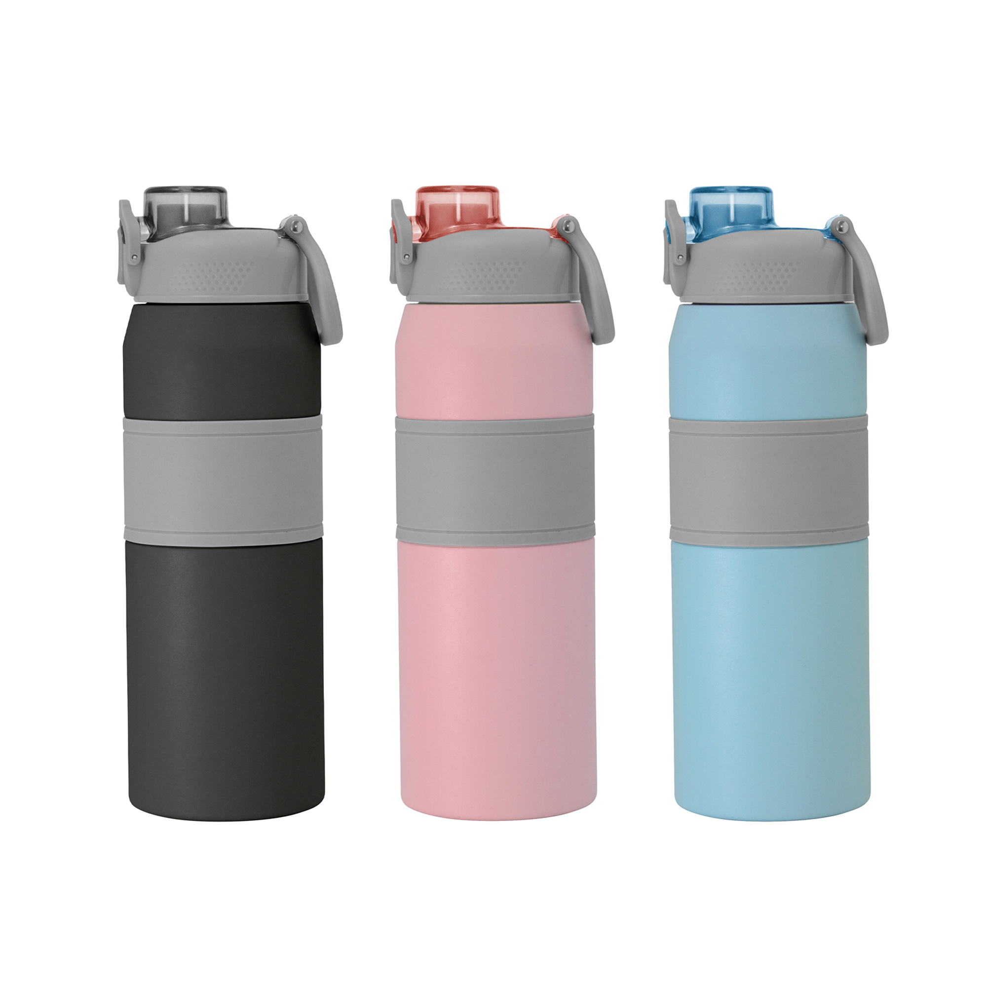 Botella deportiva con doble pared, sellada al vacío. Tecnología vacuum. Interior de acero 304 y exterior de acero 201. Pintura powder coat (pintura más duradera y resistente a la corrosión y el paso del tiempo). Tapa plástica a rosca en color gris con anillo de silicona y manija plástica para su agarre, combinada con tapa rebatible en colores translucidos a juego con el color de la botella. Boquilla con sorbete incluido. Grip de silicona color gris para mejor agarre. Mantiene alrededor de 8 hs la temperatura de las bebidas calientes y frías.