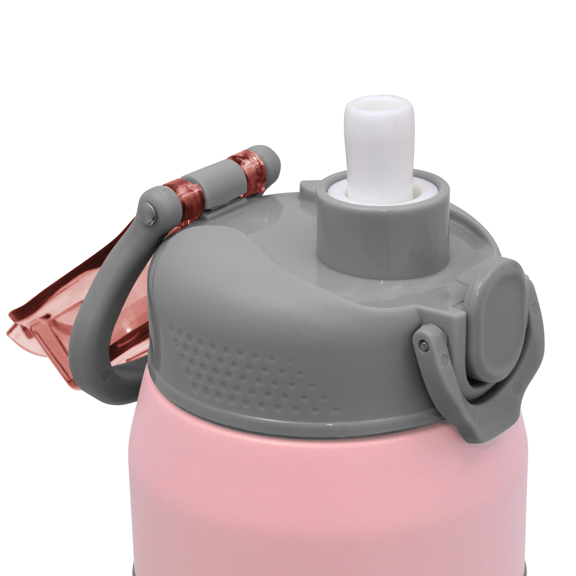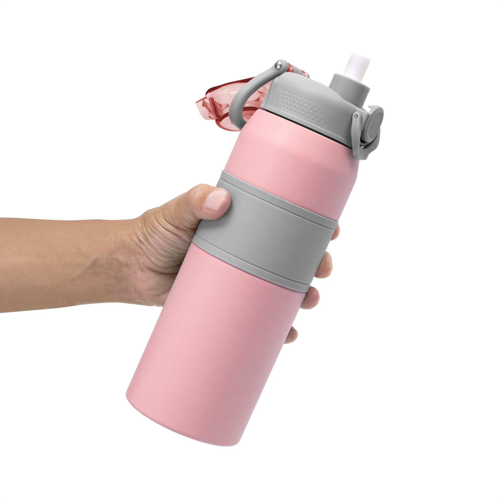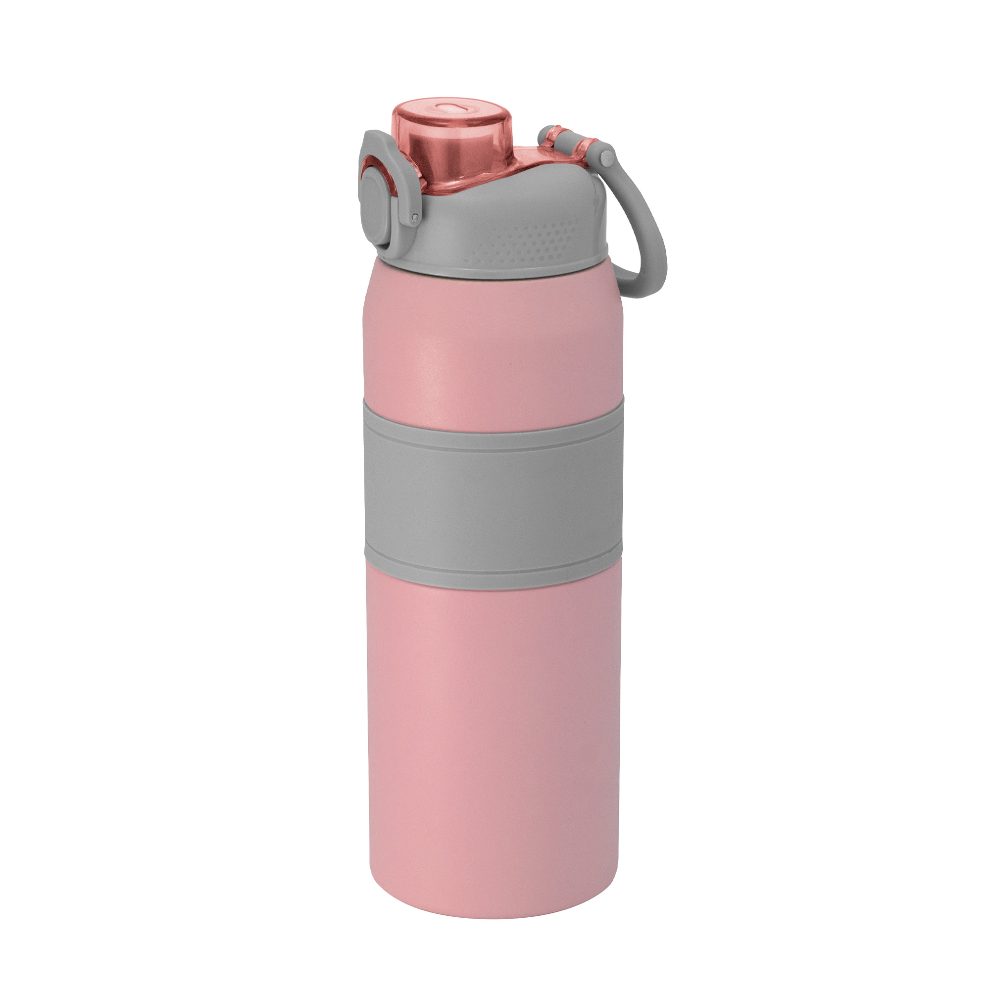 Botella deportiva con doble pared, sellada al vacío. Tecnología vacuum. Interior de acero 304 y exterior de acero 201. Pintura powder coat (pintura más duradera y resistente a la corrosión y el paso del tiempo). Tapa plástica a rosca en color gris con anillo de silicona y manija plástica para su agarre, combinada con tapa rebatible en colores translucidos a juego con el color de la botella. Boquilla con sorbete incluido. Grip de silicona color gris para mejor agarre. Mantiene alrededor de 8 hs la temperatura de las bebidas calientes y frías.